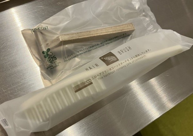 ホテルのアメニティ(歯ブラシ、ヘアブラシ、カミソリなど)にはプラスチックの割合が少ないコーンスターチ配合のECO製品を使用したり、ホテル所有の車両をEVにするなど、社長様のお考えのもと様々な取り組みが行なわれています。
