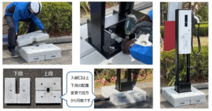 普通充電器(Pit-2G/3G専用)の基礎工事をわずか10分で完了させる置き基礎「NTV600」を展示します。従来の土木工事が不要となり、導入コストの削減と高い安全性を両立させ、EV充電インフラ整備の障壁を大幅に引き下げます。